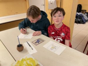 Au cours de cet atelier, les élèves ont d’abord appris à fabriquer leur propre encre, comme on le faisait au Moyen Âge, à partir de pigments et de recettes anciennes. Ils ont ensuite réalisé une enluminure représentant un chevalier, en s’inspirant des manuscrits médiévaux.