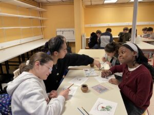 Au cours de cet atelier, les élèves ont d’abord appris à fabriquer leur propre encre, comme on le faisait au Moyen Âge, à partir de pigments et de recettes anciennes. Ils ont ensuite réalisé une enluminure représentant un chevalier, en s’inspirant des manuscrits médiévaux.